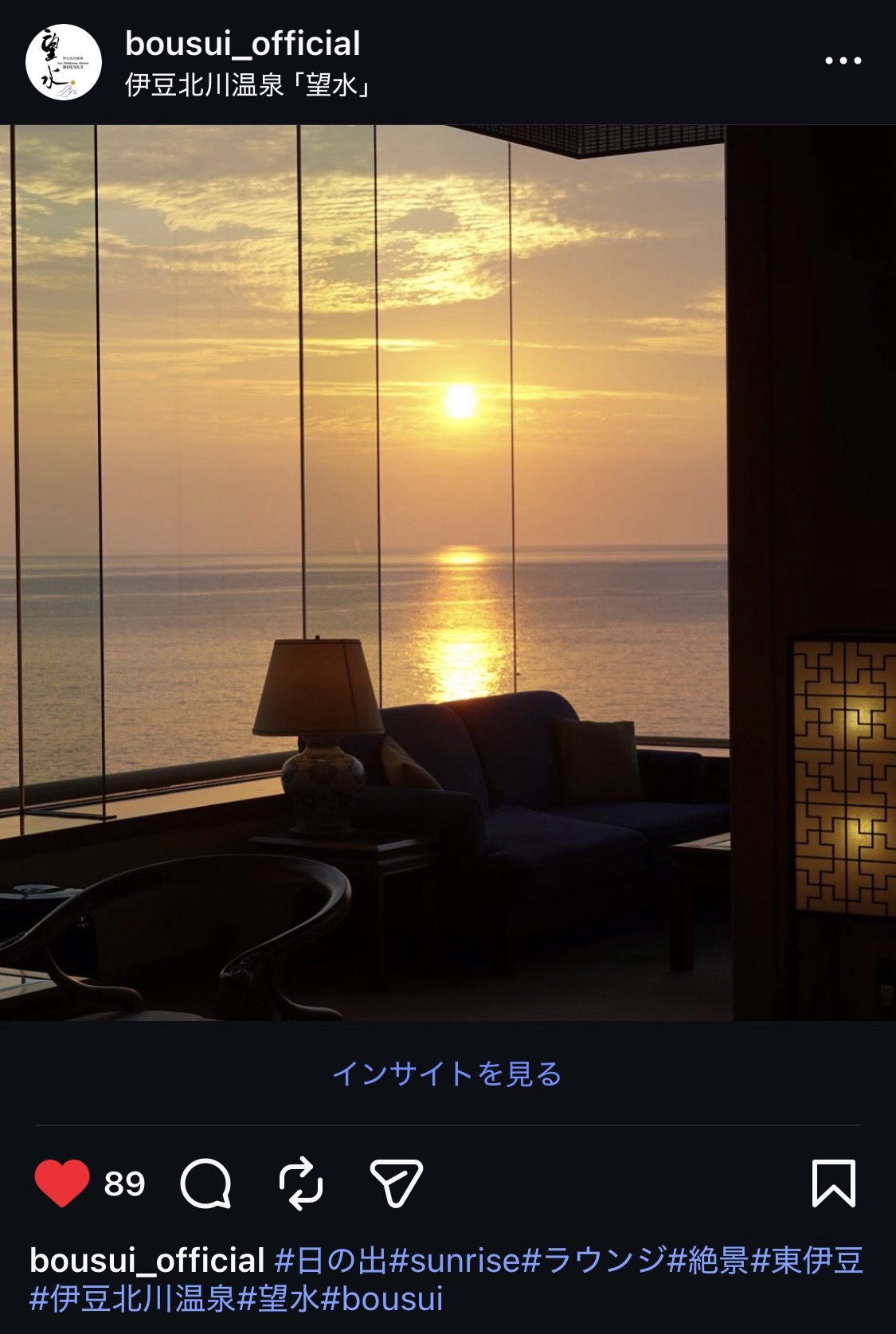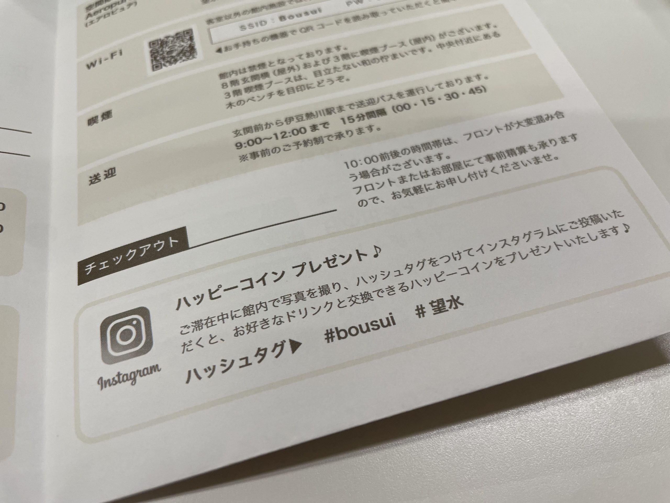 ご滞在中に館内で写真を撮り、ハッシュタグ(#bousui / #望水)をつけてご自身のインスタグラムに投稿をしていただくと、ラウンジでお好きなワンドリンクが利用できるハッピーコインをプレゼントしています。