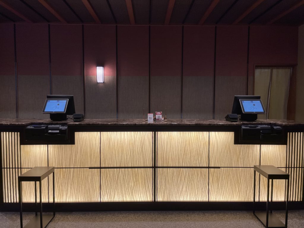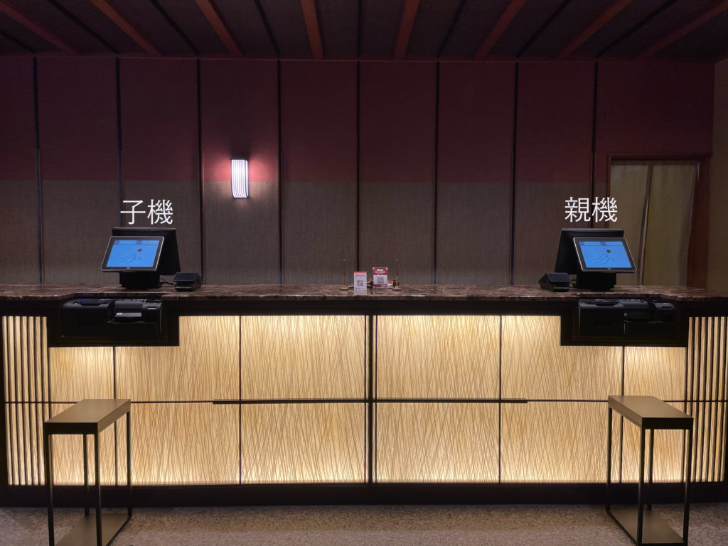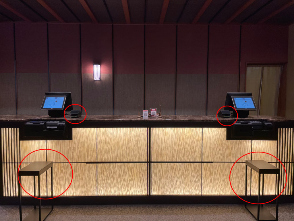 フロントレジ周辺備品(クレジット端末・テーブル)の位置についてご案内です。