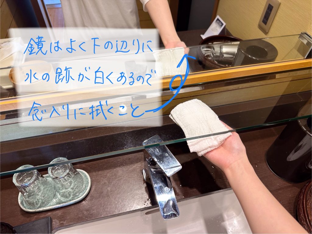①ハンドタオルを1枚軽く濡らす。びしょびしょだと水の跡が残るので、湿らせる程度で良い。ガラスの台のものを全て下ろし、ハンドタオルで鏡と台の表裏を拭く。(望水タオルで拭くと、タオルのケバケバが残るのでハンドタオルを使う)