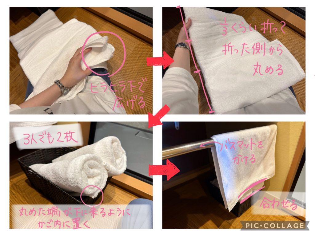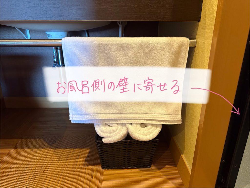 ①バスタオルとバスマットは使っていなければそのままで良い。使用済みのものは補充する。