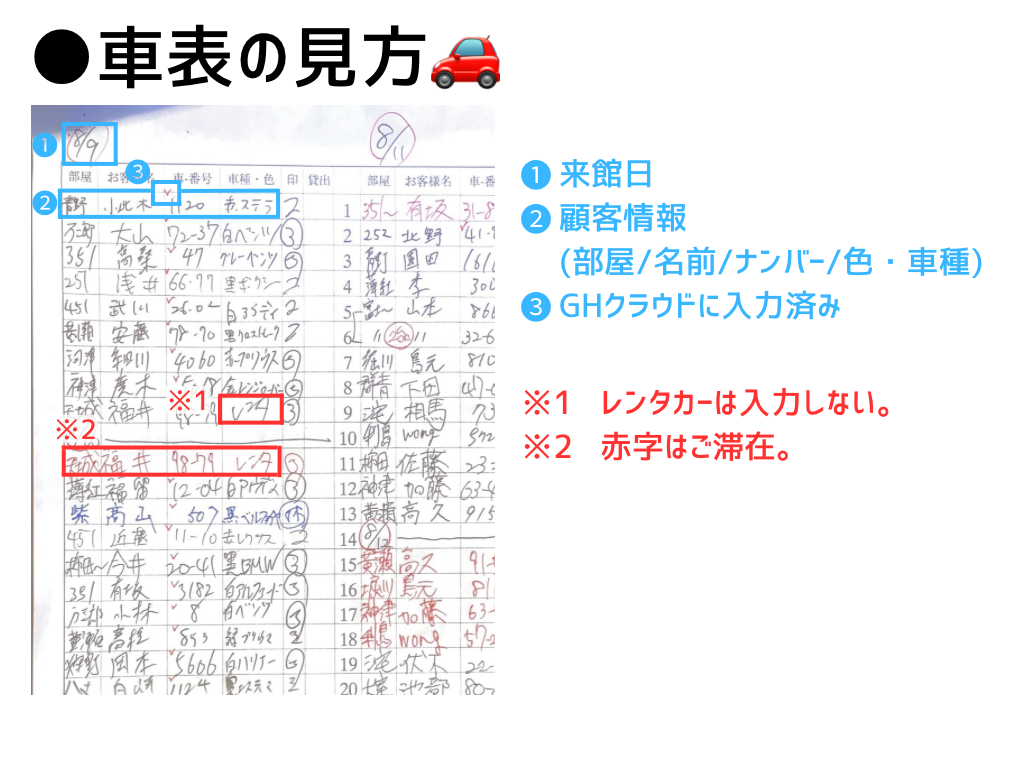 車表を見て、✔︎の次から入力。 ※優先順位は低いので、他の業務を優先!
