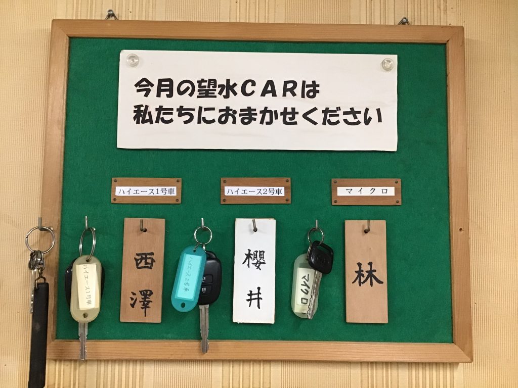 ・各社用車のキーは、8階事務所のタイムカードの上の置き場で管理している。