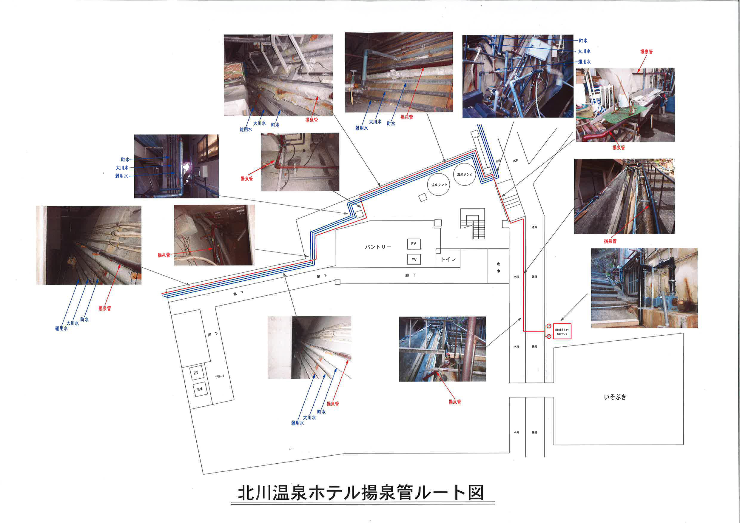 上記は望水敷地内(4F温泉タンク廻り)を通っている、北川温泉ホテルの配管図(揚泉管・町水管・大川水管・雑用水管)となる。3F洗い場付近・食器庫付近の天井より水漏れ等が起こった場合には、高確率で上記いずれかの配管不良によるものと考えられる。